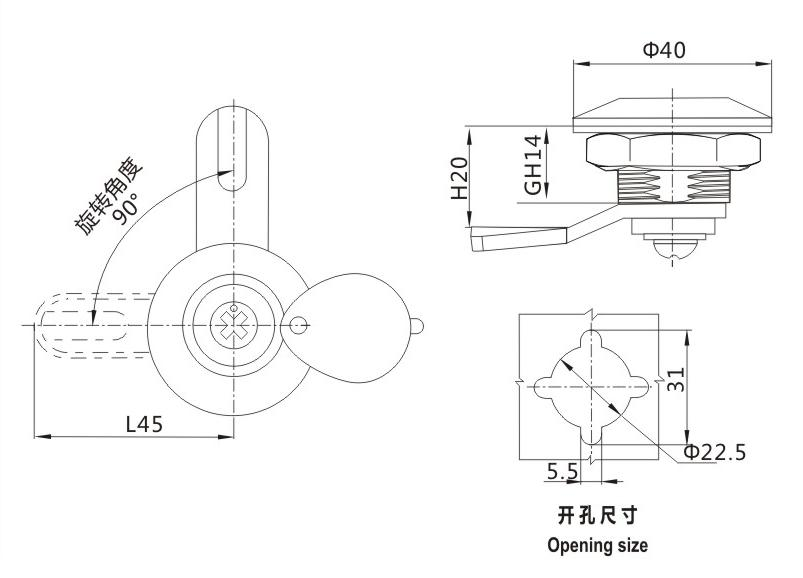 结构说明: 旋转90°开启或锁 闭