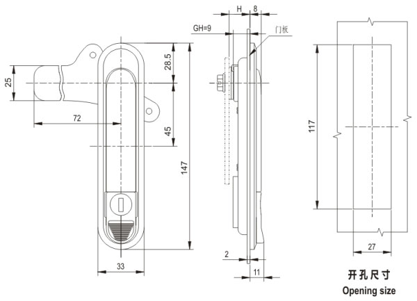 Structure: | push the button and swing 90°the handle to open or lock. |