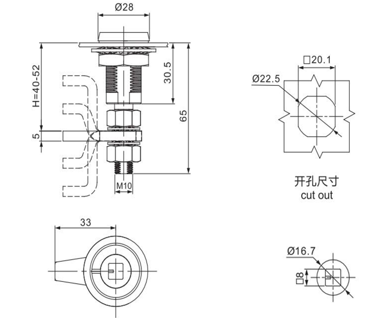 材料:锌合金锁壳和锁芯,碳钢钢栓和螺母