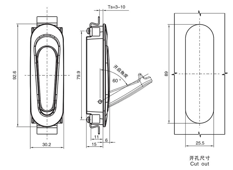 按下按钮,弹出手柄旋转60°实现开启或锁闭 |